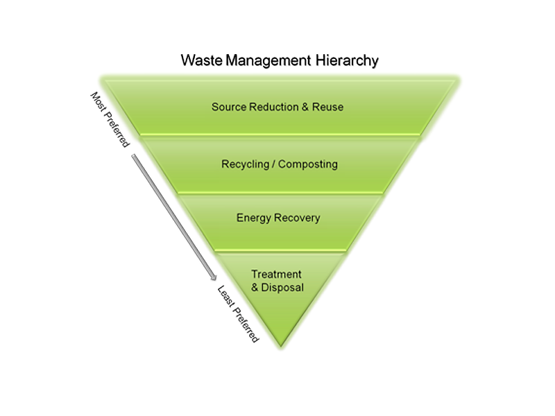 A waste management hierarchy prioritizes preventing waste and minimizing disposal.